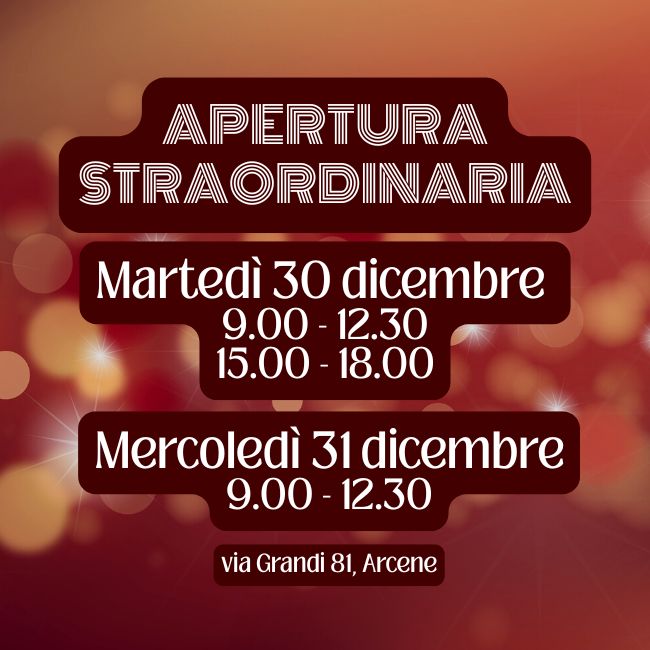 Martedì 30 e mercoledì 31 dicembre, aperti secondo gli orari indicati....